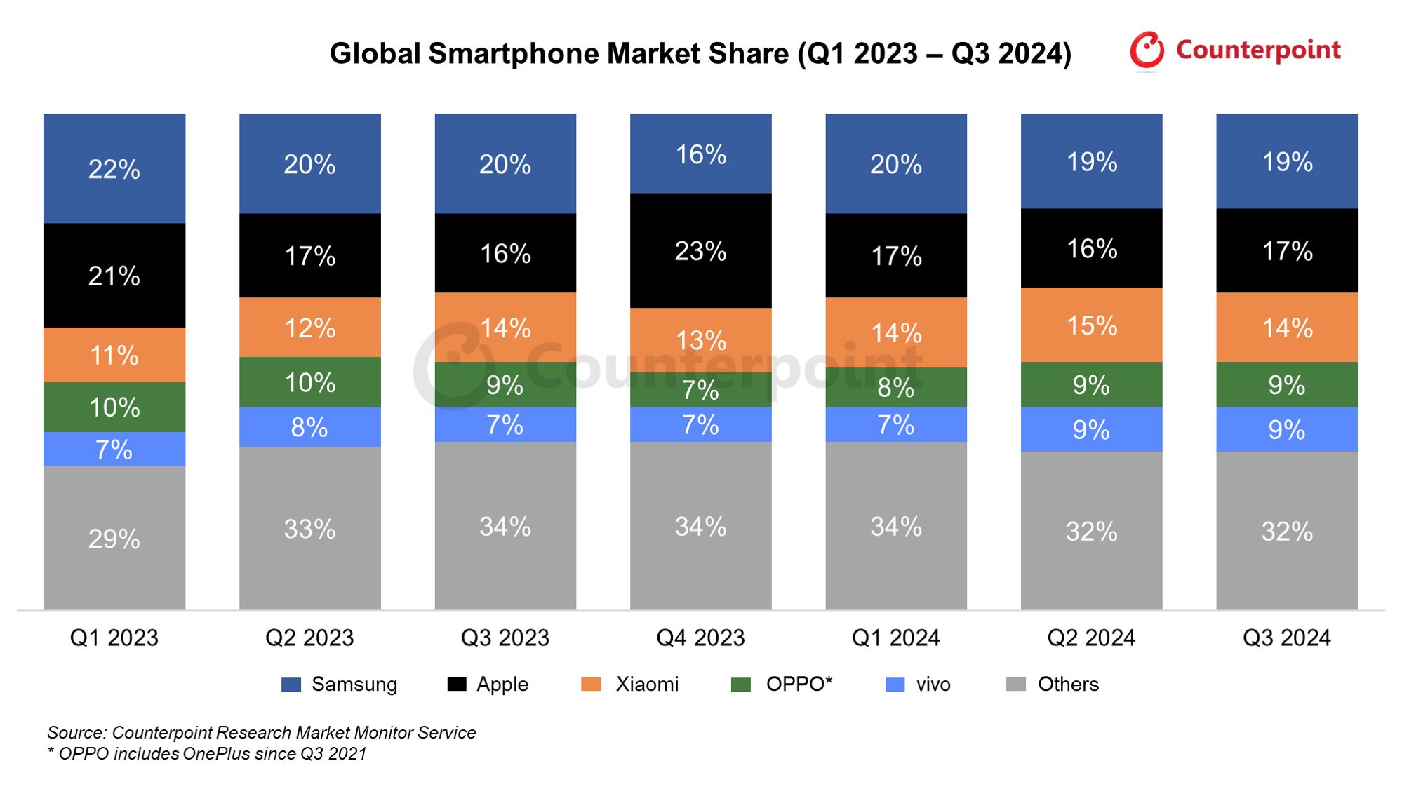 IT之家 11 月 25 日音书,市集造访机构 Counterpoint Research 今天(11 月 25 日)发布博文,证明 2024 年第 3 季度跟着欧洲、加勒比和拉丁好意思洲以及东南亚市集的握续复苏,群众智高东说念主机出货量达到 3.07 亿台,同比增长 2%。