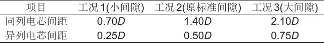 为了探究电芯间距大小对于浸没电板包温度的影响,规则三种电芯间距的臆测工况,见表6。